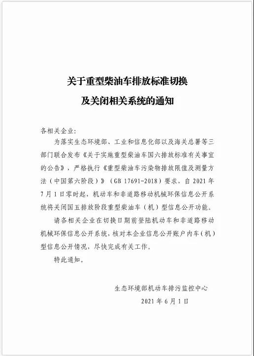 為落實(shí)生態(tài)環(huán)境部、工業(yè)和信息部以及海關(guān)總署等三部門聯(lián)合發(fā)《關(guān)于實(shí)施重型柴油車國六排放標(biāo)準(zhǔn)有關(guān)事宜的公告》,嚴(yán)格執(zhí)行《重型柴油車國六排放標(biāo)準(zhǔn)有關(guān)事宜的公告》,嚴(yán)格執(zhí)行《重型柴油車污染物排放限值及測量方法(中國第六階段)》(GB 17691-2018)要求,自2021年7月1日零時起,機(jī)動車和非道路移動機(jī)械環(huán)保信息公開系統(tǒng)將關(guān)閉國五排放階段重型柴油機(jī)車(機(jī))型信息公開功能。
