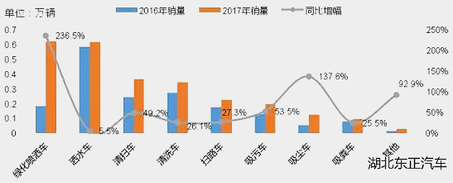 從車輛功能來(lái)看,市政環(huán)衛(wèi)車市場(chǎng)主要是以綠化噴灑車、灑水車、清掃車與輕型車為主,2017年四者的市場(chǎng)比重高達(dá)近75%,其中綠化噴灑車市場(chǎng)表現(xiàn)尤為突出,1~7月份,其銷量為6212輛,同比提升236.5%,比重由2016年的10.6%提升至23.6%。近年來(lái),我國(guó)部分城市的霧霾較為嚴(yán)重,各地方政府對(duì)霧霾的治理工作十分重視,極大地刺激了綠化噴灑車的市場(chǎng)需求增長(zhǎng)。除此之外,吸污車、吸塵車等小眾市場(chǎng)在2017年也有不俗的表現(xiàn),其中吸塵車市場(chǎng)銷量增幅高達(dá)137.6%,隨著城市功能的不斷完善,城市對(duì)市政環(huán)衛(wèi)車的功能需求逐漸向多樣化發(fā)展。