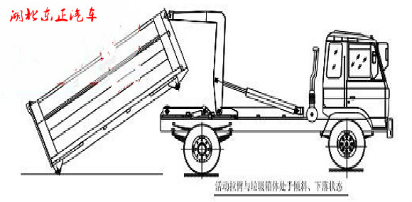 步驟 9. 垃圾箱放置好后,調(diào)整活動拉臂鉤與箱體彎鉤位置,使其脫鉤,將拉臂操作手柄推下到落下位置,拉臂油缸收回,活動拉臂繞翻轉(zhuǎn)翻轉(zhuǎn)架前鉸鏈軸旋轉(zhuǎn),活動拉臂放回到附 車架上,松開取力器垃圾箱放置完成,整車可以運輸行駛;