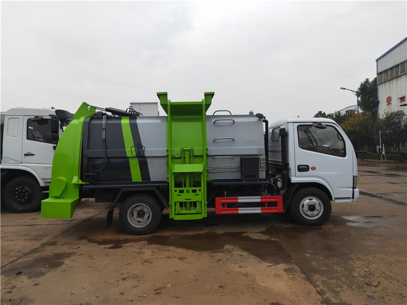 方罐式餐廚垃圾車:弧形廂體,箱體內(nèi)可實現(xiàn)固液分離,推鏟卸料,后蓋液壓開啟/鎖緊(帶耐磨橡膠密封條密封-后門關(guān)閉后滴水不漏),后門液壓鎖緊防誤操作功能,掛桶式提升機,可配合120升、240升標(biāo)準(zhǔn)垃圾桶使用,清洗裝置(帶水箱、液壓馬達帶動高壓泵)。